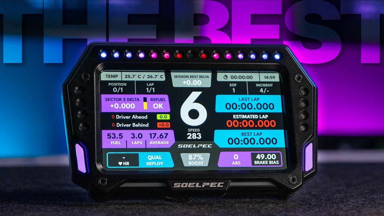 The Soelpec XR-5 Dashboard delivers a 5' 854×480 display, 15 shift lights, and 8 flag lights for high-end sim racing realism.